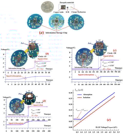 Based on the experimental conclusions drawn above, the dosage of copper azide is 0.52 mg; the Psd test results obtained for the ISCs are shown in Figure 9. When the number of cycles = 5, Vsignal-1 = 1.728 V, and Vsignal-2 = 4.56 V, the Psd time (from TLGE absorption to detonation wave generation) is 10 µs. When the number of cycles = 15, Vsignal-1 = 2.1 V, and Vsignal-2 = 4.48 V, the Psd time is 14 µs. In summary, when the number of cycles ranged from 1 to 14, the variation in the Psd response time was only 40%. When the number of cycles reached 20, the Psd time reached 32 µs, which is 2.2 times longer than the original Psd time, and the mechanical response of the TLGE showed fatigue accumulation behavior.