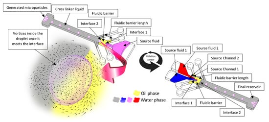 Our previous works introduced the concept of a fluidic barrier with applications in multiple emulsion and microparticle generation, and compared this method with other available droplet generation methods []. Fluidic barriers can be utilized to separate reactive chemical components, such as a polymer and its crosslinker liquid. Here, we focus solely on microparticle generation application to characterize different controlling parameters and present new details of this phenomenon. We also broaden the concept to include highly viscous working fluids, high rotational speeds, and droplet generation of two source fluids. Using two source fluids can help the automation of the process. Figure 1 illustrates the fluidic system. The gray fluid shows the crosslinker, and the yellow fluid shows the oil that separates the polymer and the crosslinker. Because the centrifugal force depends on the fluid’s density, the crosslinker should be denser than the oil. Two viscous fluids (red and blue) are loaded in separate source reservoirs. Since they have a higher density than their medium, they make a droplet and, while crossing the fluidic barrier, mix before solidification and accumulate in the final reservoir. We show that transient secondary flows within the droplets produce good mixing. We study the importance of the fluidic barrier length, the rotational speed, and the source channels’ width. Establishing the relative importance of these different parameters will help scientists significantly in designing centrifugal microfluidic devices using fluidic barriers.