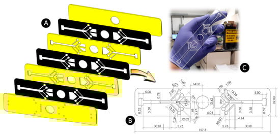 (A) Different layers of the microfluidic device, (B) the dimensions (mm), and (C) one of the fabricated devices. The three black layers represent the PSA, and the four yellow sheets show the PMMA.