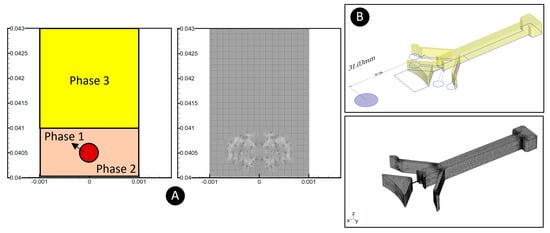 (A) The geometry and grids used for the three-phase modeling. The red circle shows the droplet in the water phase (phase 1), the orange medium shows the oil phase fluidic barrier (phase 2), and the yellow rectangle shows the other water phase (phase 3). (B) The geometry and grids used for the particle tracing model.