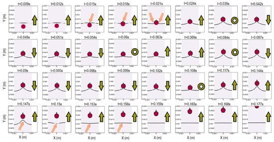 We investigate here what happens when a droplet crosses the border of the fluidic barrier. According to the results, when a droplet touches the border of the fluidic barrier, it does not cross it spontaneously. It sticks to the phase interface for a while, and then a super-fast reciprocating process occurs. In Figure 4, we show how the droplet crosses the border of a fluidic barrier; the water phase (phase 1) droplet is shown as a red circle, and the solid black line is the border of the oil phase (phase 2) liquid. Here, the phase 2 liquid is located at the bottom, and the phase 3 liquid is located on top of the interface. As the droplet touches the solid line at t = 0.015 s, one tiny droplet is trapped on top of the main droplet. This is a tiny droplet of phase 2 liquid carried with the red droplet. This droplet remains in the red droplet’s centerline and is carried with that in our model. If this droplet leaves the red droplet’s centerline for any unbalanced condition, it will go back and merge with the oil phase fluidic barrier due to the lower density. Similar to the mentioned droplet, two more tiny oil droplets detach at t = 0.021 s once the red droplet is more clearly in the phase 3 liquid. However, since they have a lower density than the phase 3 liquid, they go back towards the fluidic barrier and merge quickly due to the centrifugal force (Equation (1)). The orange arrows in Figure 4 show these droplets. The yellow arrows on the right section of each image show the moving direction of the red droplet based on a rotating coordinate system, and the yellow circles demonstrate the times at which the red droplet stops moving and the moving direction changes. The droplet velocity inverts its direction at times of 0.039, 0.06, 0.084, and 0.108 s. For the first reciprocating phenomenon at t = 0.039 s, the red droplet has the minimum displacement from the fluid’s interface, and for the second time at t = 0.084 s, this displacement increases. Once the red droplet crosses the interface at t = 0.144 s, the interface shows a quick vibration until t = 0.156 s (the orange arrows in Figure 4). When the droplet is separated, it continues to move forward within the fluidic barrier.