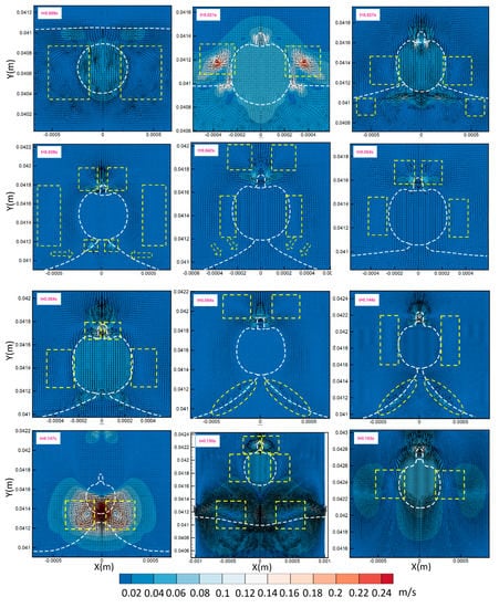 When the droplet passes through the interface quickly, fluid flow patterns change substantially. In Figure 5, we depict some selected instant fluid patterns inside the droplet and the surrounding fluids. Times associated with particular flow patterns are written on the upper-left side in pink, and a white dashed line shows the liquid phase borders. In addition to the arrows showing the flow patterns, the color here corresponds to the velocity magnitude of the fluid. As shown, there are two symmetrical vortices at t = 0.009 s, before the droplet touches the interface. According to our model, as the droplet touches the interface, the maximum velocity increases initially (as a case in point, see t = 0.021 s). These local high-velocity regions are related to the rapid movement of tiny droplets due to the centrifugal force, as shown in Figure 4. Afterward, the number and position of the vortices around the droplet change, which are marked by the yellow dashed lines. Furthermore, we also notice that when the droplet meets the interface, some tiny vortices appear at the interface itself (see t = 0.039 and 0.042 s). Finally, as shown in the last image at t = 0.165 s, when the droplet crosses the interface, the two circulating vortices return to their initial state (before the droplet touched the interface).