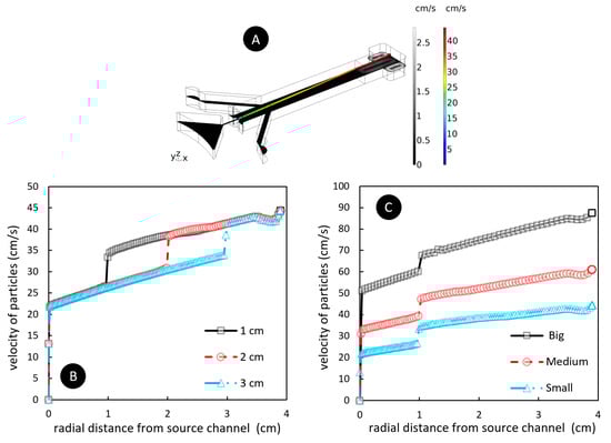 In Figure 6A, we represent the velocity contours and the particle trajectories within the fluid for a rotational frequency of 50 Hz and a fluidic barrier length of 3 cm. Although some vortices are made in each phase due to the rotational platform, the velocity magnitude of the fluid particles is small. According to this model, under the same conditions, the fluidic barrier length does not affect the velocity of the particles when they pass the fluidic barrier. In Figure 6B, we depict the particle’s velocity versus the radial distance from the source channel. The only difference between the fluidic barrier lengths of 1, 2, and 3 cm for a rotating speed of 50 Hz is the position of the velocity ramp due to the location of the fluidic barrier interface. We know that this sudden increase is due to the sudden decrease in drag force, which helps particles accelerate within the fluid. The effect of source channel width on the generated particle’s velocity at f = 50 Hz and with a fluid barrier length of 1 cm, is shown in Figure 6C. In this figure, small, medium, and big channel sizes correspond to the widths of 300, 600, and 900 µm, respectively. As the channel width increases, the velocity and acceleration magnitude of the particles increase but its behavior after crossing the fluidic barrier interface is almost linear. The same behavior was observed for the other fluidic barrier lengths of 2 and 3 cm.