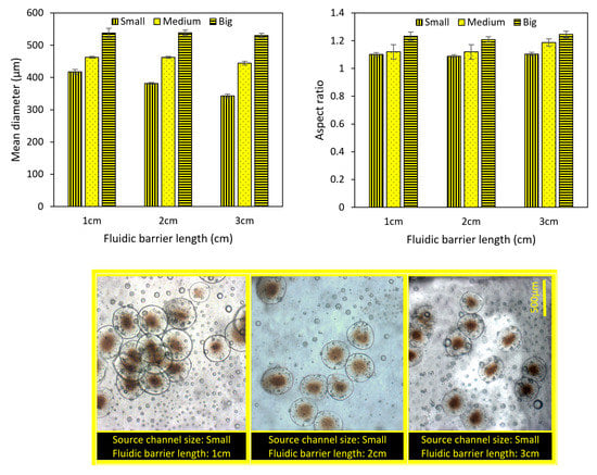 As two of the most significant parameters, we investigated the effect of the fluidic barrier length and source channel widths on the size and shape of the microparticles. According to Figure 7, three different fluidic barrier lengths of 1, 2, and 3 cm are investigated for three different source channel widths at f = 50 Hz. Small, medium, and big channel sizes correspond to 300, 600, and 900 µm, respectively. The mean diameter and aspect ratio are defined as Equations (18) and (19), respectively.