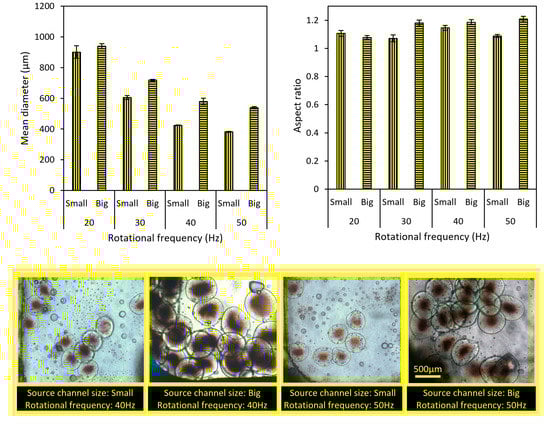 Here, the effect of the rotational frequency on the size and aspect ratio of microparticles is investigated. As the rotational speed increases, the size of microparticles decreases. This decrease is not linear and is smaller at higher rotational speeds. According to Figure 8, it is observed that this behavior is independent of source channel width and is similar for both the small and big source channels. Moreover, we did not see any meaningful differences in the aspect ratio of the generated microparticles over different rotational frequencies between 20 and 50 Hz.