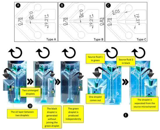 (A–C) Three different configurations of the joining source microchannels. The lengths are in millimeters. (D) The phenomenon happens using joining channel Type-A. (E) The phenomenon happens using joining channel Type-B. This behavior was also observed in Type-C.