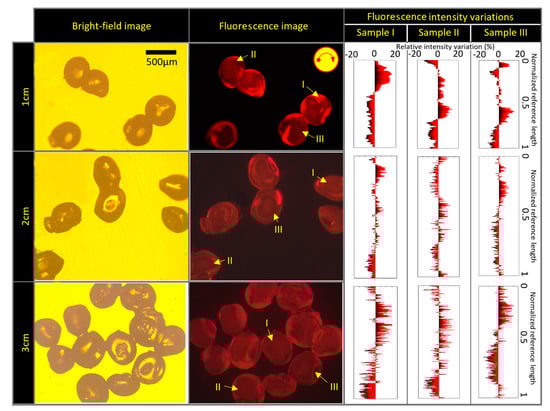In the next step, in order to investigate the mixing of source fluids, Rhodamine-6G florescent fluid was used as the source fluid 1, and DI water was used as the source fluid 2. In Figure 10, the bright-field and fluorescence images are shown at f = 50 Hz. Moreover, we examined the effect of fluidic barrier length by investigating three different fluidic barrier lengths of 1, 2, and 3 cm. In order to quantify the mixing phenomena due to the secondary vortices, the fluorescence intensity was measured along a circular path within each particle, as shown in a yellow circle in Figure 10. This circle has a radius equal to one-half of the particle’s radius (r = R/2, where R is the particle radius). This reference length starts from the left point, and is nondimensionalized by the total length of the path. The measured intensities were normalized by the average fluorescence intensity of the corresponding particle. . The relative intensity variation versus the normalized reference length is plotted for all different samples. As shown in Figure 10 for the three samples, the fluorescence signal exists along the reference curve, and the maximum deviation of the signal is less than 15%. This observation was seen in all samples. It proves that the fluorescence fluid is mixed with the DI water in all particles. In addition, the fluidic barrier length did not play any role in the final particle’s size and aspect ratio when we used two source fluids. In some of the experiments, if a large number of particles in the chamber are collected, they may stick together poorly (like the particles in Figure 10 for the fluidic barrier length of 3 cm). This is more likely to happen at high rotational frequencies due to higher centrifugal force. Then, we can use a 15-second vibration on a vortex device if we want to separate all of the particles.