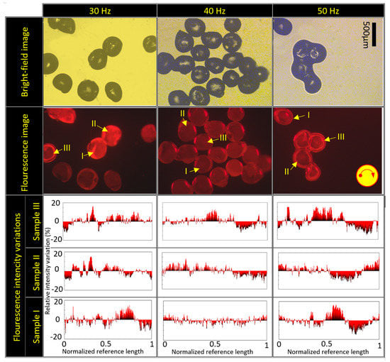 Finally, the effect of rotational frequency on the mixing of the two source fluids was investigated. We increased the rotational frequency from 30 to 50 Hz (the maximum motor operating frequency in the set-up) to establish the effects on fluid mixing. Some examples of the bright-field and fluorescence images are shown in Figure 11 using the fluidic barrier length of 2 cm. Relative intensity variation versus the normalized reference length for three samples is shown in the last row in Figure 11. It was seen that, in all generated particles, the fluorescence intensity had a maximum variation of less than 15% compared to the average fluorescence intensity of each particle. This shows that good mixing of two source fluids occurs, even at different rotational frequencies (30 to 50 Hz) due to the secondary internal vortices.