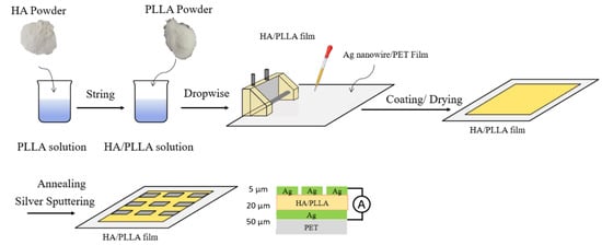 HA (Chengdu Organic Chemicals Co., Ltd., Chengdu, China) and PLLA (NatureWorks, 2003D) were dispersed in trichloromethane (CHCl3). The mixed solution was magnetic-stirred and scrap-coated onto a silver nanowire with polyethylene terephthalate (PET) film. Then, the wet film was placed in a vacuum oven to evaporate the solution and form a 10 μm-thick composite film.