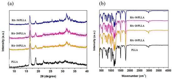 The (a) XRD and (b) FTIR spectra of PLLA and HA/PLLA composite films.