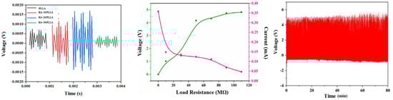 The FTIR spectra of the composite films were obtained using a Bruker Tensor 27 spectrometer. The spectra were obtained in the range from 4000 cm−1 to 500 cm−1. The X-ray diffraction (XRD) measurements were performed on a D/Max2500 VB2t/PC X-ray diffractometer (Rigaku, Japan) for a 2θ range of 5–50°. The energy harvesting performance, including the output voltage and load resistance behavior, of PLLA and HA/PLLA PENG was assessed using a high-speed-acquired card (NI 9308), as shown in Figure 2.
