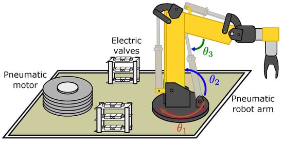 The employment of pneumatic actuators in the robotic field has great importance in the manufacturing industry and the modern design of controllers [,]. Its significant advantages are a low-cost, lightweight, and simple design. The disadvantages are the highly non-linear behavior of the pneumatic actuators due to having the air as a means of generating force, e.g., the flow of air into the valves is not uniform, friction in the joints, and delay in air propagation, among others [,,,,].