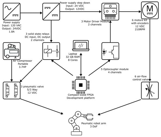 In this work, we used 24-VDC and 12-VDC power supplies. An FPGA was the core of this project and also a laptop for data acquisition, Octave script development, and FPGA programming. Eighteen optocouplers isolated the FPGA control signals from the motor drivers to prevent electric noise, and six solid-state relays activated the 12-VDC electro-valves. The motors adjusted the airflow through the pneumatic actuators. The pneumatic electro-valves controlled the direction movement of the links of the robot. Figure 2 illustrates all these components