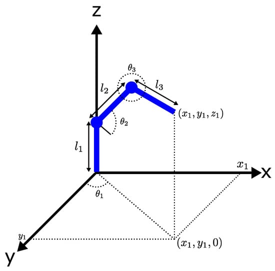 Figure 3 depicts a geometrical model of a 3-DoF robot, and it provides information to compute the final position of the robot [], where:
