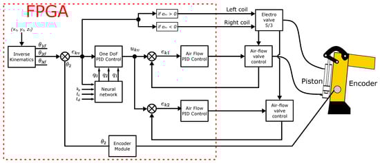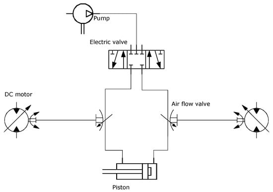 Each DoF consists of one 5/3 electro-pneumatic valve, two airflow valves, two DC motors, and one incremental encoder that allowed us to get the arm position. In Figure 4, the schematic diagram of each DoF is drawn.
