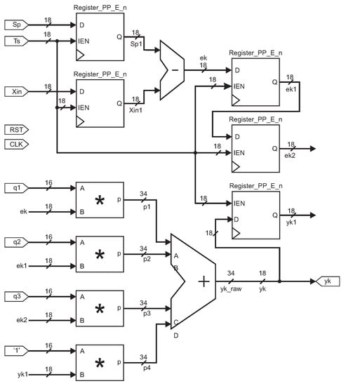 Figure 8 is the PID block diagram for hardware configuration; the Register_PP_n module loads the input signal every period to compute the output yk. A subtraction module was applied to compute the actual error ; the , and signals are the controller constants. An adder module is used to compute , and four multipliers modules are implemented. The controller output signal is set to 18 bits.