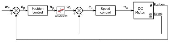 Based on Equations (12) and (13), Figure 9 shows the arm position and speed control proposal, where is the desired position, is the error position, is the control signal. We used a saturation block where is the saturation value and the maximum velocity desired. is the speed error, and is the control signal for the DC motor. The motor encoder sends position and speed feedback to the controller.