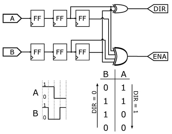 The quadrature encoder module has two inputs, Channel A and B. DIR output signal gives the direction of the motor. ENA is active when a state changes on channels A and B. We implemented six flip-flops type D to catch the signals, one XOR Gate with two inputs for DIR output and another XOR gate with four inputs for ENA output. Figure 10 displays the architecture and the corresponding truth table of the encoder module.