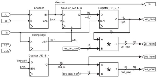 Figure 11 presents the quadrature encoder instrumentation, written in Octave software. The motor channel inputs are A and B. Ts is the period signal. We set a counter for the pulses from the encoders for the speed. When the signal activates the rising edge module, the counter value is saved, and it is reset to start over. In Figure 11, outputs are drawn. The vel_nom and pos_nom are the raw values of the velocity and position. These have 16 bits.