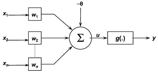The weighting carried out by the synaptic junctions of the network is implemented on the artificial neuron as a set of weights . Analogously, the relevance of each of the inputs is measured by multiplying them by their corresponding weight , then weighting all the external information arriving at the neuron. Therefore, the neurons output is denoted by y, representing the weighted sum of its inputs. Equations (18) and (19) synthesize the result produced by the artificial neuron [].