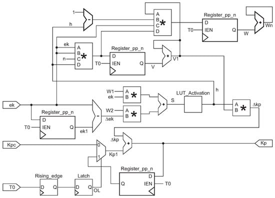 Figure 14 shows the design of the neurons for , and identical block diagrams are implemented for and . And they need to be initialized in this structural design. , , and are the constant inputs. The Rising_edge and Latch modules detect the first pulse of the period signal , adding these variables to a summand that stores the initial value and updates the value of the kp, ti, and td variables. For , a subtraction with a delay module is implemented to achieve , for s signal two multipliers with an adder module were implemented for (24). To achieve (25) a LUT was implemented, and it contains values between −1 to 1.