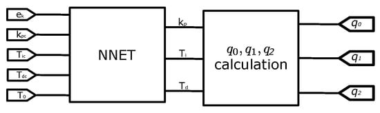 The specific purpose of this design is to properly use perceptron neurons to tune the variables , , and of a digital PID controller in Equation (13). The objective is the mean square error, with a tuning on each variable. These neurons are constantly learning. And the steps for the algorithm are the following [].
