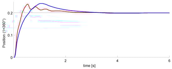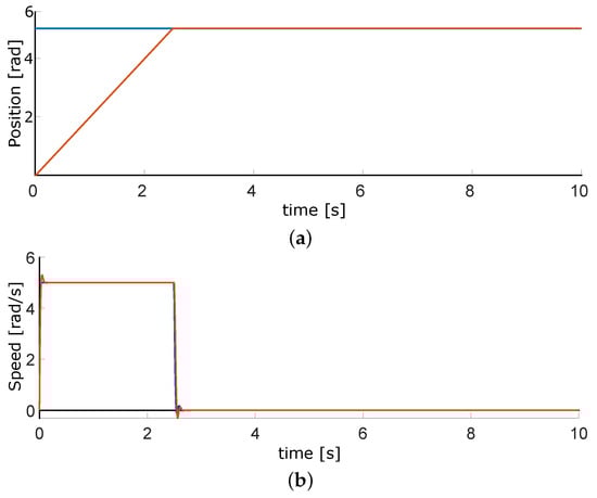 Simulated results for position and velocity control of DC motors where the blue lines are the setpoint and red ones the control signals. (a) Position plot. (b) Velocity plot.