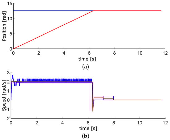 Experimental results for position and velocity control of DC motorswhere the blue lines are the setpoint and red ones the control signals. (a) Position plot. (b) Velocity plot.