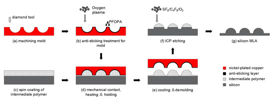 - Chang, C.Y.; Yang, S.Y.; Huang, L.S.; Chang, J.H. Fabrication of plastic microlens array using gas-assisted micro-hot-embossing with a silicon mold. Infrared Phys. Technol. 2006, 48, 163–173. [Google Scholar] [CrossRef]