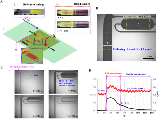 The microfluidic device was positioned on an inverted microscope (IX53, Olympus, Tokyo, Japan) with a 4× objective lens (NA = 0.1). Two kinds of polyethylene tubing (length = 400 mm, inner diameter = 250 µm) were tightly connected to two inlets (a, b). Additionally, one kind of polyethylene tubing (length = 200 mm, inner diameter = 250 µm) was fitted to the outlet. To remove air inside the channels and avoid nonspecific bonding of plasma proteins, bovine serum albumin (BSA, CBSA = 1 mg/mL) was injected into the tubing connected to the outlet. The microfluidic channels filled with BSA were maintained for 10 min. Thereafter, the microfluidic channels were again filled with 1× PBS (phosphate-buffered saline) by injecting it through the outlet. As shown in Figure 1(A-ii), a syringe filled with reference fluid (30% glycerin solution) was installed into a syringe pump (neMESYS, Cetoni GmbH, Korbußen, Germany). The flow rate was set to 0.5 mL/h (Qr = 0.5 mL/h). Simultaneously, a syringe filled with blood was installed in the syringe pump. As shown in Figure 1(A-iii), the syringe pump was installed horizontally. As a preliminary demonstration, blood (Hct = 25%) was prepared by adding normal RBCs to a dextran solution (5 mg/mL). The flow rate of the blood syringe was set to 0.5 mL/h (Qb = 0.5 mL/h). From two snapshots captured at t1 = 0 and t2 = 11 min, RBC sedimentation occurred in the blood syringe. RBC sedimentation caused a decrease in hematocrit in the blood flowing in the microfluidic channels. Based on the two mechanical properties (i.e., blood viscosity and junction pressure) that are influenced by the hematocrit of blood, variations in RBC sedimentation were monitored over time.