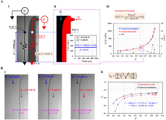 To validate the analytical expressions for the junction pressure (i.e., Equations (1) and (2)), numerical simulations were conducted using a commercial software (CFD-ACE+, Ver. 2021, ESI Group, Paris, France). The test and reference fluids were selected as 1× PBS and 30% glycerin solutions, respectively. The corresponding viscosities of each fluid were assumed to be µr = 3 cP (reference fluid) and µt = 1 cP (test fluid) [28]. The flow rate of each fluid was set to Qr = 0.5 mL/h and Qt = 2 mL/h. Figure 2(A-ii) shows the interface in the coflowing channel. The right panel shows the variations in P(L*) along the channel width. As expected, the junction pressure remained unchanged along the channel width. Both the streams had the same junction pressure at a specific location. The junction pressure and interface were obtained as P(L*) = 333.8 ± 1.1 Pa and β = 0.595, respectively. For convenience, the junction pressure without a correction factor (CP) (i.e., Equation (1)) was employed to validate the analytical expression in the coflowing channel. Figure 2(A-iii) shows the variations in Pr (L*) obtained by the numerical simulation and the analytical formula with respect to β. The normalized difference (ND, Δ) was obtained by comparing the junction pressures obtained by the numerical simulation (■) and the analytical formula (○). The results indicate that the junction pressure increased significantly when the interface moved from the left wall (β = 0) to the right wall (β = 1). It increased significantly from 154 to 1346 Pa. In addition, ND was less than 6% when the interface was located from β = 0.1 to β = 0.9. From the results, Equation (1) could be used to obtain the junction pressure in the coflowing channel consistently.