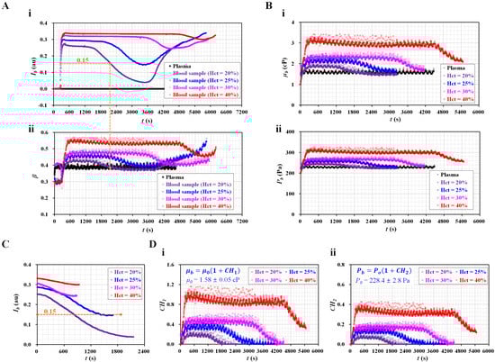 Figure 4(A-i) shows the temporal variations in Ib with respect to Hct. Ib increased substantially when the blood flowed into the blood channel. Thereafter, RBC sedimentation significantly caused a decrease in Ib over time. When compared with the control blood (Figure 3(A-i)), the dextran solution caused a considerable decrease in the duration of flat image intensity. The Ib of the blood (Hct = 30%) decreased substantially over time without a flat image intensity. That is, the Ib decreased substantially at lower hematocrits. Figure 4(A-ii) shows the temporal variations in β with respect to Hct. The β of the blood (Hct = 30%) reached a steady value without a peak. Blood RBCs did not have an influence on the blood flow. However, the remaining two blood samples (Hct = 40% and 50%) had peak values of β. RBCs in the blood caused an increase in β. However, the β reached a steady value early. Figure 4(A-iii) shows the temporal variations in µb with respect to Hct. Within a specific time, when the image intensity was less than 0.15, the viscosity of the diluent was µ0 = 2.25 ± 0.04 cP.