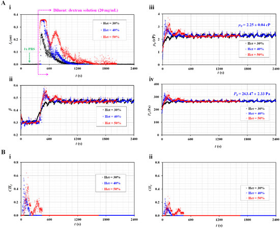 As shown in Figure 4(A-ii), the blood viscosity increased for a short period for the two blood samples (Hct = 40%, 50%). The viscosity of blood (Hct = 30%) was the same as that of the diluent (Cdex = 20 mg/mL). Figure 4(A-iv) shows the temporal variations in Pb with respect to Hct. The junction pressure of the diluent was determined to be P0 = 263.47 ± 2.33 Pa. The trends of Pb were similar to those of µb.