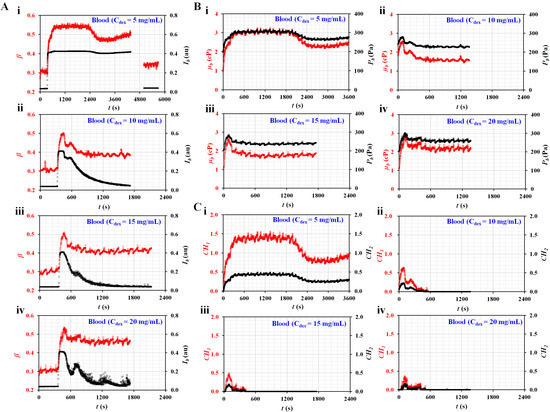 Figure 5A shows the temporal variations in Ib and β with respect to the concentrations of dextran solution (Cdex) ((i) Cdex = 5 mg/mL, (ii) Cdex = 10 mg/mL, (iii) Cdex = 15 mg/mL, and (iv) Cdex = 20 mg/mL). Here, the Ib of the blood (Cdex = 5 mg/mL) did not decrease below 0.15. Thus, after the experiment, a dextran solution without RBCs (Cdex = 5 mg/mL) was tested to obtain Ib and β over time. Variations in β and Ib were added after t = 4800 s. It was then possible to obtain µ0 and P0 of the diluent (i.e., Cdex = 5 mg/mL). However, the remaining blood samples were separated into blood and diluent. After an elapse of a certain time, the Ib of each blood decreased to below 0.15. The µ0 and P0 of each blood were obtained by analyzing the temporal variations of β, which remained unchanged over time. Figure 5B shows the temporal variations in µb and Pb with respect to Cdex ((i) Cdex = 5 mg/mL, (ii) Cdex = 10 mg/mL, (iii) Cdex = 15 mg/mL, and (iv) Cdex = 20 mg/mL). Except for the blood (Cdex = 5 mg/mL), the dextran solution contributed to accelerating RBC sedimentation substantially. The viscosity and junction pressure had an early peak value. They remained unchanged for a long time. Figure 5C shows the temporal variations in CH1 and CH2 with respect to Cdex ((i) Cdex = 5 mg/mL, (ii) Cdex = 10 mg/mL, (iii) Cdex = 15 mg/mL, and (iv) Cdex = 20 mg/mL). As a result, the blood (Cdex = 5 mg/mL) had higher values of CH1 and CH2 for a longer period than the other bloods. The dextran solution contributed to accelerating RBC sedimentation in the blood syringe. Furthermore, the two coefficients (CH1 and CH2) calculated from viscosity and junction pressure exhibited distinctive trends with respect to the concentration of the dextran solution.