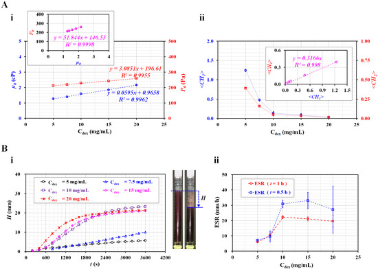 For comparison with the results obtained using the present method, the ESR was measured with a conventional ESR method. In the modified ESR method, a 1 mL disposable syringe was filled with 1 mL blood, and installed vertically against the gravitational direction. Figure 6(B-i) shows the temporal variations in RBC sedimentation (H) with respect to Cdex. The H tended to increase gradually for three bloods (Cdex = 5, 7.5, and 10 mg/mL). However, for bloods that were higher than Cdex = 10 mg/mL, the H was saturated above 2400 s, approximately. Subsequently, substantial RBC sedimentation did not occur over time.