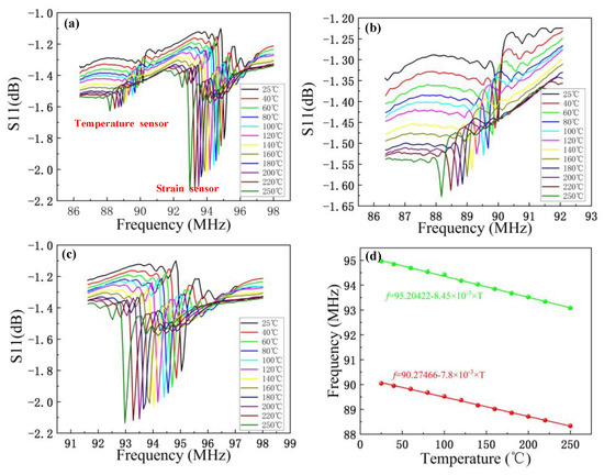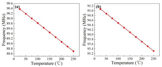 The simulation obtained frequencies of 95.076 MHz and 90.3775 MHz, respectively, resulting in a frequency difference of 4.6985 MHz, which can realize the separation of the two frequencies. Figure 1 shows the relationship between the frequency and temperature of the temperature–strain sensing unit within the temperature range of 25–250 °C. The change in frequency of the temperature-sensitive unit is 1.6765 MHz (Figure 1a), and the change in frequency of the strain-sensitive unit is 1.763 MHz (Figure 1b). This design of the interdigital width of the sensing unit can avoid frequency crosstalk caused by temperature changes.