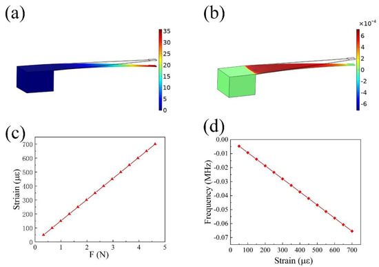 The strain test platform was simulated and designed. (a,b) Strain and displacement distribution of cantilever beam under 4.62 N pressure. (c) The relationship between the pressure loaded on the cantilever beam and the strain at the position of the strain sensor. (d) The relationship between the strain loaded on the sensor and the frequency shift of the strain sensor.