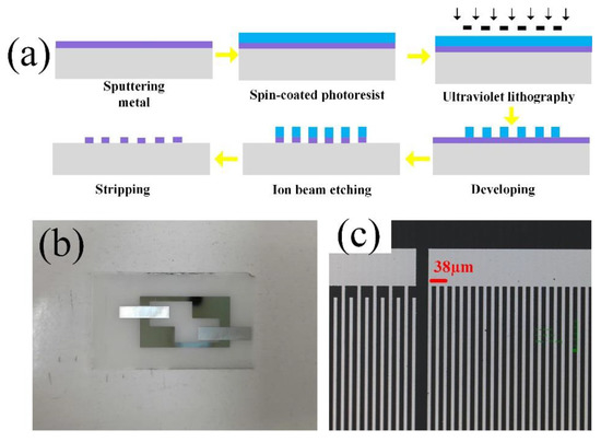 Figure 3a shows the fabrication process of the device. First, the substrate was cleaned with acetone and alcohol, and then the metal layer Cr/Pt (20/180 nm) was sputtered on the substrate by magnetron sputtering. Cr was first sputtered to increase the adhesion between the substrate and metal. The pattern was then formed using a standard lithographic process. The metal outside the figure was etched using an ion beam. After the device was soaked in acetone for half an hour, ultrasonic stripping was performed. Figure 3b shows an optical image of the device, and Figure 3c presents a microscopic view of the interdigital electrode, which shows that the metallization rate is 0.5..