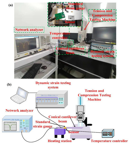 The temperature test device is composed of a temperature control box and a heating platform. The strain test platform is the constant stress cantilever beam designed by us. The strain platform is fixed on the heating platform using a clamp so that the sensor can measure the temperature and strain on the composite test platform. A network analyzer was used to test the frequency and frequency shift of the sensor unit as a function of temperature and strain. Using high-temperature glue, the strain sensor was pasted to the position of maximum strain. The temperature sensor was placed at the fixed end and was not pasted to the strain test platform. In this way, only the strain sensor can perceive the strain when an external force is loaded at the free end, whereas the temperature sensor is not affected by the strain and its frequency does not change. A standard strain gauge was pasted on a position symmetrical to the SAW strain sensor to calibrate it, as shown in Figure 4. The standard strain gauge was connected to a terminal, and the terminal was connected to the dynamic strain testing system through a cable. The strain testing system was connected to a computer, and the dynamic measuring system of strain gauge on the computer recorded the changes in the standard strain gauge. The solder pad of the sensor was connected with silver wire to the solder pad of the printed circuit board (PCB). The solder pad of the PCB was connected to a Sub Miniature version A (SMA) head. The SMA head and the network analyzer were connected by the cable wire.