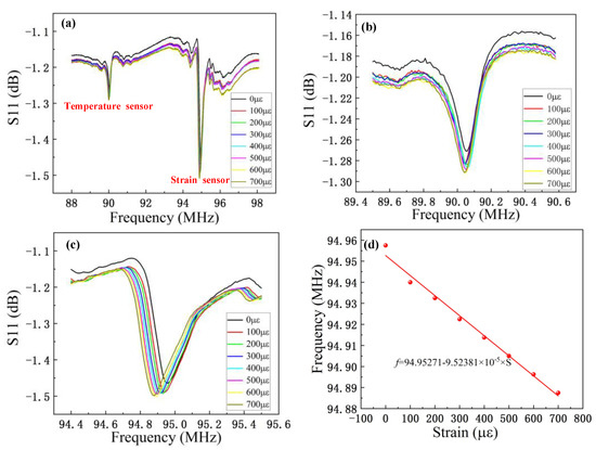 To test the strain-sensing ability of each sensing unit, we conducted further tests on the temperature and strain test platform. The strain sensitivity of each unit was tested in a temperature range of 25–250 °C and a strain range of 0–700 μԑ. We first tested the S11 curves under different strains at room temperature, as shown in Figure 6a. Figure 6b shows the response of the temperature-sensitive unit to strain. The strain varies within the range of 0–700 μԑ, but the frequency of the temperature-sensitive unit does not change when pressure is applied. This is because the temperature-sensitive unit is located at the fixed end of the platform. The size of its fingers does not change when external forces are applied to the free end of the platform. When a force is applied at the free end, the strain test platform deforms. Because the sensor is stuck to the strain platform, the strain of the test platform is transferred to the sensor, and the sensor also deforms, resulting in changes in the center frequency of the SAW strain sensor. Figure 6c presents the S11 curve of the strain-sensing unit, which shows that the frequency of the strain sensor decreases with increases in strain. The main reason is that when the strain increases, the width of the cross-finger electrode increases; that is, the wavelength increases, resulting in a decrease in frequency. Strain will also lead to changes in propagation velocity, but these changes are small, so the influence on frequency can be ignored [32]. Figure 6d shows the relationship between the frequency of the strain-sensitive unit and strain. The relationship between the strain and the frequency is linear. In the range of 0–700 μԑ, the variation in strain is 70 kHz, and the sensitivity is 100 Hz/μԑ.