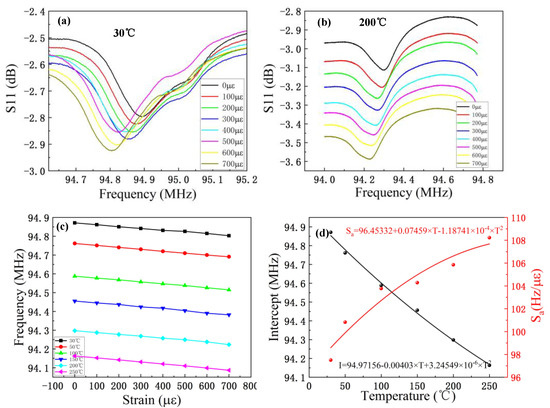 μԑ. (b) Strain response curve of the strain sensor at 200 °C for 0–700 μԑ. (c) The relationship between resonant frequency and strain of the strain-sensing unit under different strains at 30~250 °C. (d) Polynomial fitting of the slope and intercept of the curve of resonance frequency variation with strain at different temperatures.