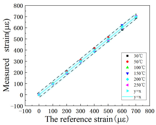 The ambient temperature was tested by the temperature sensor, and the strain was calculated using Equation (3). The calculated error between the measured strain and the reference strain is shown in Figure 8, which is within the range of ±4.62%. The error may be caused by inaccurate measurement and the approximate linear fit shown in Figure 7c.