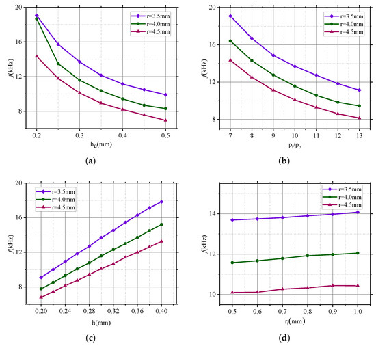 Since the two resonant frequency values for are exactly the same, only one value is given in this paper. Resonant frequencies (n = 2) of microhemispherical shells with different parameters are shown in Figure 6. The results show that the resonant frequency is greatly affected by the depth of the substrate annular groove (), the internal and external pressure ratio () and the thickness of the device layer (h), while it is less affected by the inner diameter of the annular groove (), which is basically consistent with the influence of , , h and on the shape of the microhemispherical shell. Moreover, for different outer diameters of annular grooves (that is, the radius of the bottom surface of the microhemispherical shell), the influence rules are the same.