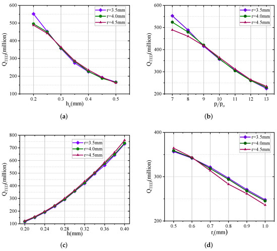 In this section, fused silica is chosen as the device material. The finite element simulation analysis is based on thermoelasticity physics. At the same time, the Q of the microhemispherical shell resonator is simulated assuming TED is the only dominant dissipation mechanism. Figure 7 gives the of microhemispherical shells with different parameters. is the Q due to TED.