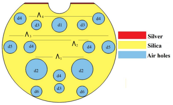 Figure 1 shows the schematic diagram of a D-shaped PCF with a silver layer coated on its top surface. In the proposed structure, the air holes are arranged in a hexagonal lattice with 3.5 µm lattice size. The air holes that have different diameters ranging from 1.5 to 3.3 µm form a single-core PCF. Here, a unique PCF structure with minimal number of air holes is used for higher light confinement. Figure 1 illustrates the schematic diagram of the proposed reconfigurable D-shaped PCF filter/sensor. D-shaped PCF is formed by slicing the PCF at 8 μm from the core center. The 15 nm silver layer is coated on the top surface of the PCF, which acts as the noble metal. In the proposed structure, the air holes are arranged in a hexagonal lattice with a 3.5 µm lattice size forming a single-core PCF. All air holes have different diameters, ranging from d1 to d6. The values of these diameters are as follows: d1 = 2.3 μm, d2= 3.3 μm, d3 = 1.5 μm, d4 = 1.84 μm, d5 = 2 μm and d6 = 1.7 μm. The pitch value (Ʌ1) between the d2, d3 and d6 air holes is 7 μm. The pitch values Ʌ2 = 9 μm, Ʌ3 = 15 μm and Ʌ4 = 12 μm are maintained between d4, d5 and top d4, respectively. The air holes d1, d2 and d3 are located at 3.5 μm from the center in the Y axis. Air holes d4 are located at 4.5 μm from the center in the Y axis. Air holes d6 and d3 are located in the Y axis from the center at 7 μm and 6.5 μm, respectively. The chosen diameter of the PCF is 17.5 μm. A minimal number of air holes were preferred for higher confinement and also to obtain a unique structure. Here, the missing air holes are used to create an asymmetric core that helps achieve single-mode polarization filtering by increasing the birefringence. A micro-opening is created in the middle of the top side with a diameter of 3.4 μm to influence the phase-matching condition between the core mode and the plasmon mode using analyte. Furthermore, this micro-opening also provides two channels, allowing for improved interaction between the core and plasmon modes.