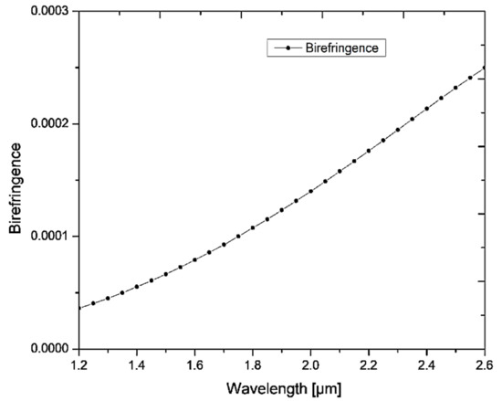 The birefringence vs wavelength of the proposed fiber without silver lining and analyte.