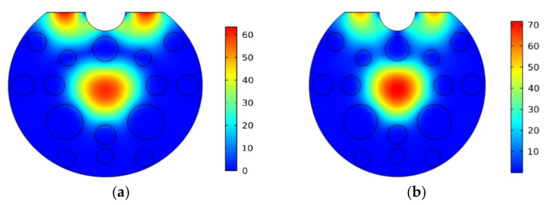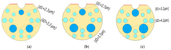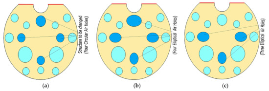 To find the optimal filter structure, different airhole shapes were chosen, from circular to ones depicted in Figure 5a–c. As the diameter of the air holes increases, the effective area of the core mode decreases, causing the resonance peak to shift toward shorter wavelengths. Figure 5a shows PCF with standard circular air holes. Additionally, the modified three elliptical air holes and four elliptical air holes are shown in Figure 5b,c respectively.