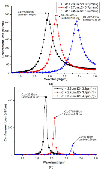 The filter characteristics of the proposed PCF structure measured for different air holes sizes are displayed in Figure 3. The confinement loss is realized using the surface resonance and it is measured for different air holes diameter values as illustrated in Figure 4a,b for both X-polarization and Y-polarization. As the air holes size decreases (high lattice), the sharp confinement loss peak shifts towards shorter wavelengths. The effective area of the core is increased as the air holes sizes are reduced. At phase-matching conditions, more energy couples from core mode to plasmon mode and it creates more confinement loss at core mode. A confinement loss of 713 dB/cm has been reported at 1.98 µm for X-polarized mode with a pitch of 3.5 µm. For Y-polarization the observed confinement loss is 426 dB/cm at 1.92 µm.