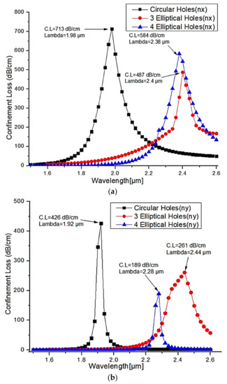 Figure 6a,b show the comparison of confinement loss peaks for the X-polarization and Y-polarization with different structures of air holes. As shown in Figure 5, circular air holes, three elliptical air holes and four elliptical air holes are preferred to improve the structure’s efficiency and thereby find the optimal structure. For wavelengths ranging from 1.5 µm to 2.6 µm, numerical analysis was carried out with a step value of 0.02. From this analysis, the observed highest confinement loss for circular air holes is about 713 dB/cm at an operating wavelength of 1.98 µm. For three elliptical holes, the observed confinement loss is 584 dB/cm at the operating wavelength of 2.38 µm. For four elliptical holes, the confinement loss is 487 dB/cm at an operating wavelength of 2.4 µm. From this graph of X-polarization, the circular air holes have the highest confinement loss compared to three elliptical holes and four elliptical holes; the difference is fairly high. The circular air holes are only carried for further analysis due to their superior performance in terms of their confinement loss.