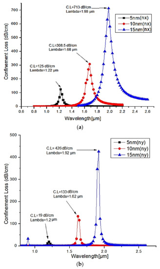 The silver lining thickness has an impact on the efficiency of the plasmonic based PCF filter by changing the plasmonic resonance. As per Chao Liu, et.al. [45], 20 nm thickness of silver provides a better sensitivity among the thickness range from 20 to 50 nm. It clearly states that less thickness provides a better surface plasmon resonance compared to the higher thickness level and hence it is decided to carry out further research to improve the sensitivity of the sensor by changing the silver coating thickness in the range between 5 nm and 15 nm with a step size of 5 nm. Out of this research, it is found and reported here that 15 nm thickness of Ag provides good confinement loss and wavelength sensitivity as shown in Figure 7a,b. Under phase matching conditions, the observed maximum loss is 713 dB/cm for the X-polarized mode at the operating wavelength of 1.98 µm. Also, the maximum loss of 426 dB/cm is recorded at the operating wavelength of 1.92 µm for Y-polarized mode.